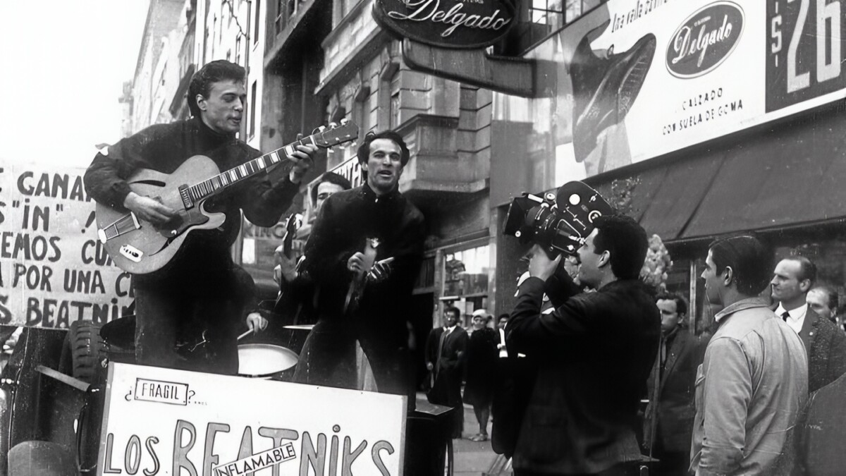 Moris (con guitarra) y su grupo, Los Beatniks, promocionando por las calles de Buenos Aires su primer sencillo, “Rebelde”. Agosto 1966.