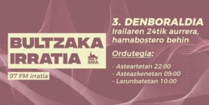97 irratian proiektu komunikatibo libre, komunitario eta eraldatzailea eraikitzen ari gara. Egunero, ehundaka gara proiektuan parte hartzen dugun pertsonak, eragiten digun errealitatea behatuz eta hura eraldatzen saiatuz, herri mugimenduekin batera.